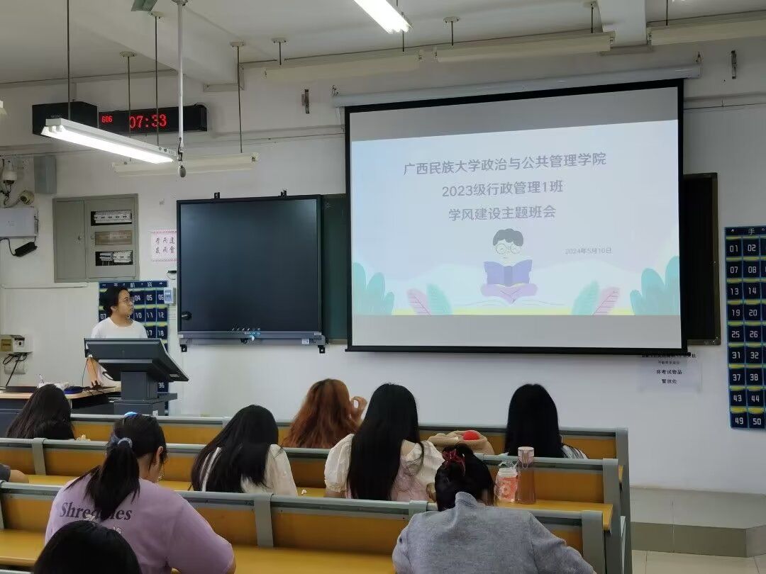 为加强班级学风建设,提高同学们的学习积极性和综合素质,营造一个积极向上、严谨求实的班级氛围,5月20日,2023级行政管理1班在学友楼603教室召开了以“学风建设”为主题的班会。班级全体成员参会,班会由班长颜如婷主持。